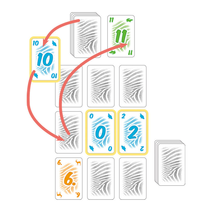 在斑馬令人眼花撩亂的斑紋中,眼尖的您能否盡快組成數字或顏色的三重奏?若您的牌陣中,水平、垂直或斜向相鄰的3張牌,顏色或數字相同,便形成一組三重奏,立刻棄掉。遊戲結束時,未棄掉的牌都會讓您扣分,扣分最少的玩家獲勝。